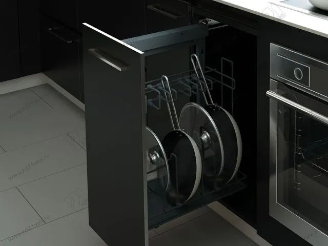 Выдвижная система для хранения сковородок позволяет удобно хранить полный комплект необходимой на кухне посуды. Каждая сковорода отделена подвижным разделителем, что защитит её от механических повреждений и поможет организовать порядок