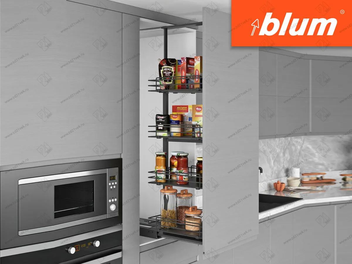 Шкаф-колонна устанавливается в кухонный шкаф и полностью выдвигается вместе с фасадом, создавая максимальный доступ ко всем вещам.