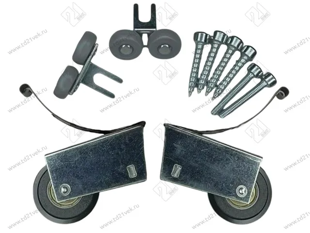 Комплект включает: 2 нижних ролика, 2 верхних ролика, 2 регулировочных винта под ключ М5, 4 сборочных самореза диаметр 6 мм под ключ М5. Нижний ролик на подшипнике, толщина корпуса 1,0 мм. Верхний ролик на втулке, пластикат, под трек 37,5 мм.