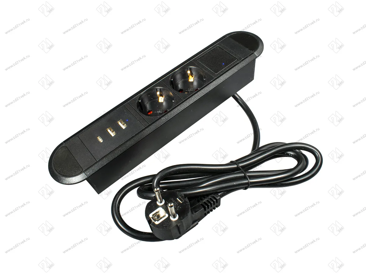 11.800.02.032 Встраиваемый блок розеток OPTIMA со скругленной рамкой, черный, 2хEU, 250В 10А, 2хUSB A+USB C 5В, 3А, с нажимным выключателем, 272х54х45мм, кабель 1,8м с вилкой EU