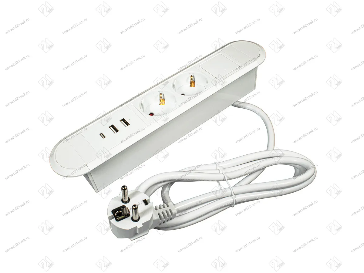 11.800.02.039 Встраиваемый блок розеток OPTIMA скругл. рамка, белый, 2хEU, 250В 10А, 2хUSB A+USB C 5В, 3А, с нажимным выключателем, 272х54х45мм, кабель 1,8м с вилкой EU