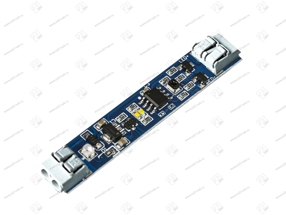 Сенсорный выключатель SIR-5DLT с терминалами предназначен для включения/отключения и диммирования светодиодных лент 12/24 В установленных в алюминиевый профиль. Устройство управляется без непосредственного физического контакта с помощью движения ладони и способно работать через светорассеивающий экран. Индикация осуществляется с помощью светодиода цветовой температурой 3000К в выключенном состоянии и 4000К во включенном состоянии.
