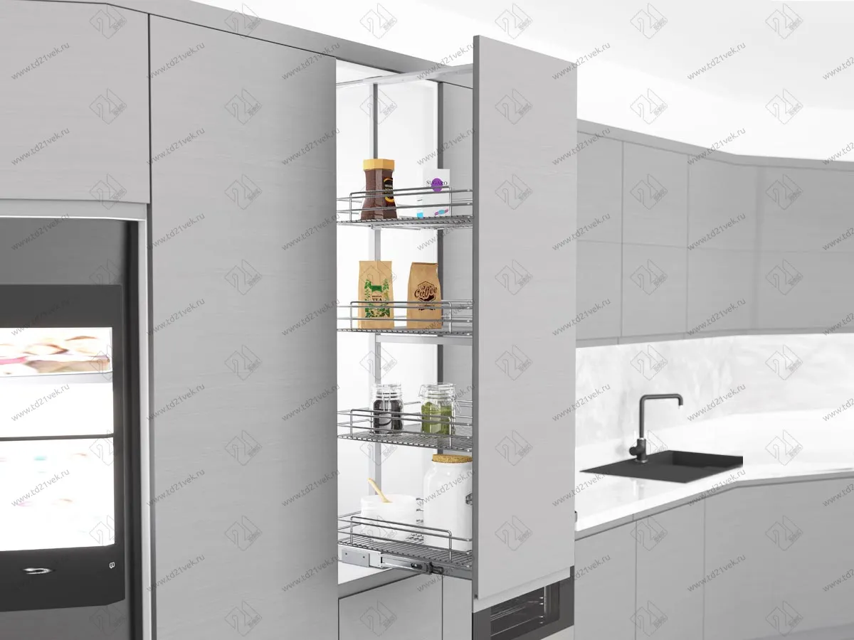 Шкаф-колонна устанавливается в кухонный шкаф и полностью выдвигается вместе с фасадом, создавая максимальный доступ ко всем вещам.
