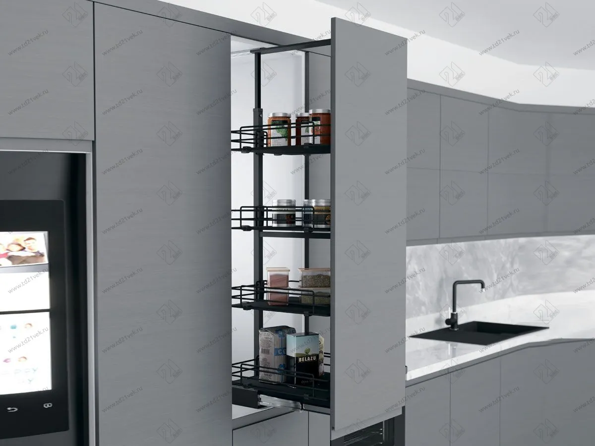 Шкаф-колонна устанавливается в кухонный шкаф и полностью выдвигается вместе с фасадом, создавая максимальный доступ ко всем вещам.