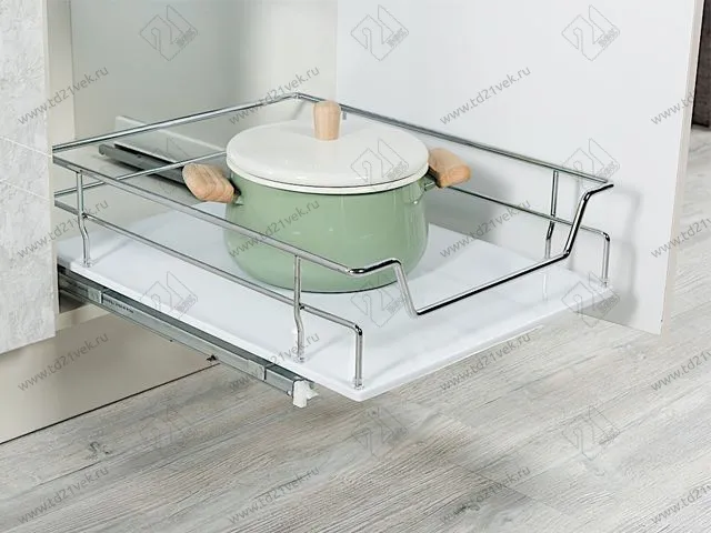 Выдвижные корзины с доводчиком предназначены для оптимизации пространства кухонных шкафов. Данная модель выполнена из ДСП и пластика в белом цвете, имеет трехслойное покрытие методом гальванизации и боковое крепление.