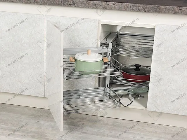 Волшебный уголок - это выдвижная корзина, которая устанавливается в угловой нижний кухонный шкаф.